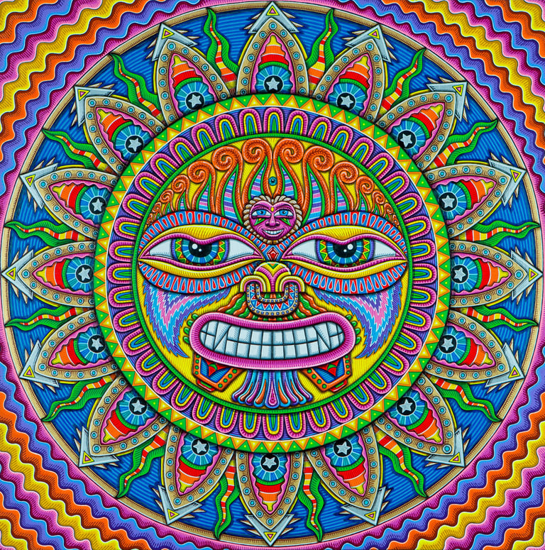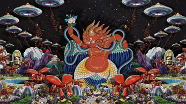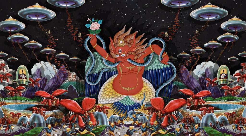 A surreal, maximalist commentary that uses the visual language of traditional Himalayan Buddhist art to explore modern themes of invasion, technological anxiety, and the enduring power of myth and spirituality in a contemporary, cosmic context.