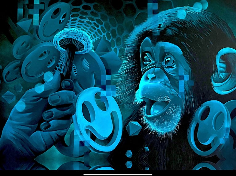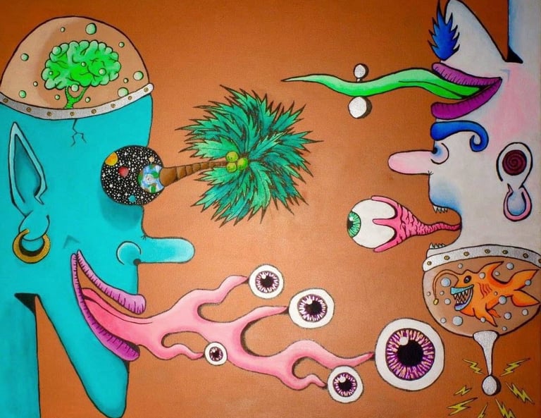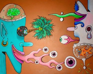 Too Faced portrays two beings in dialogue beyond words—communicating through vibration, rhythm, and shared frequency rather than speech. Through surreal forms and flowing energy, the piece suggests that true connection expands perception, opening new realms where intuition, creativity, and resonance become the language.